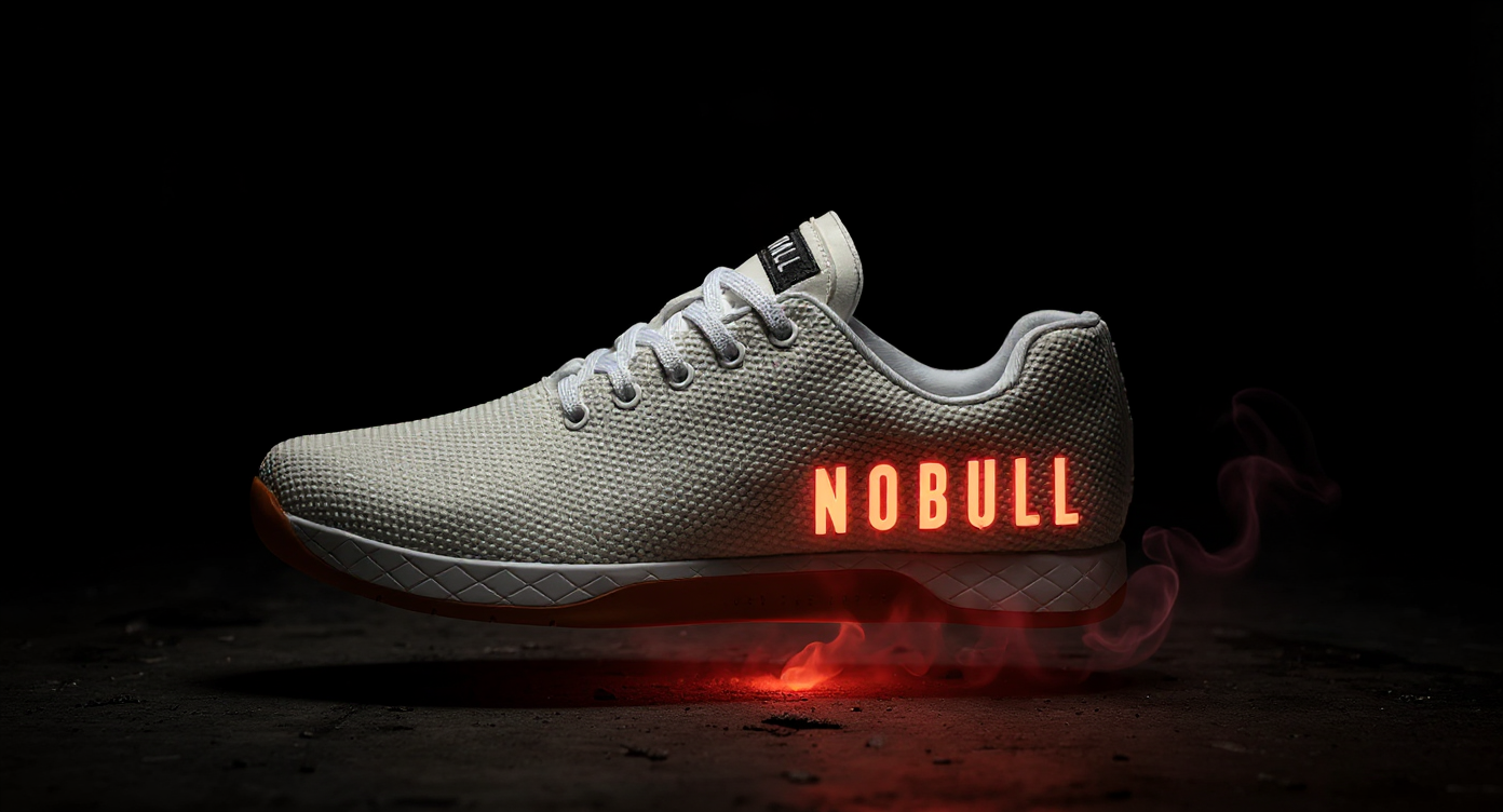 THe shoe is in a dark industrial space the NOBULL logo on the side glows red. the shoe is slightly above the concrete floor and the sole is red hot with smoke wisps coming from the shoe