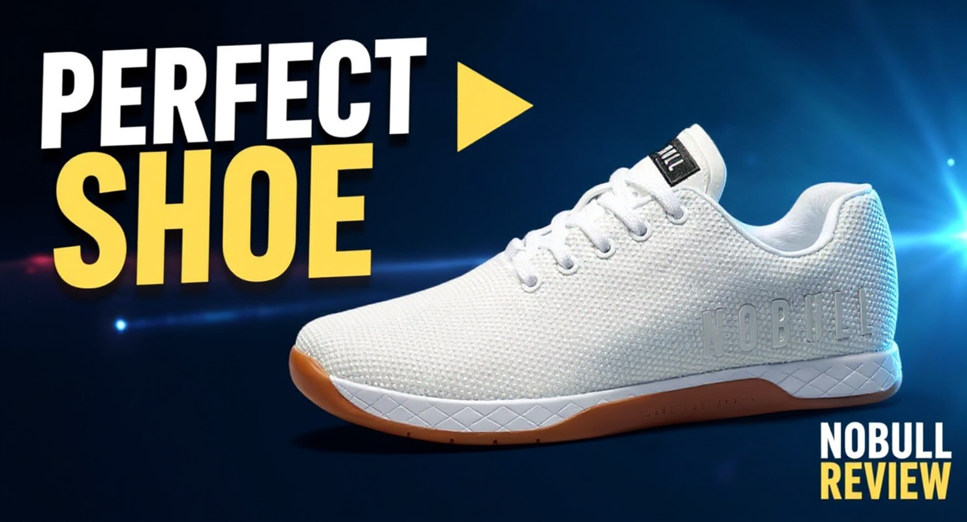Transform this white Nobull workout shoe image into a high-converting YouTube thumbnail by enhancing the existing shoe as the focal point while adding dramatic visual elements and topic-specific text. Maintain the clean white shoe as the primary subject but elevate it with professional thumbnail styling. Enhance the lighting with dramatic contrast - add bright, professional studio lighting that makes the white shoe pop against a dynamic background. Create a subtle gradient background transitioning from deep navy blue on the left to bright electric blue on the right, making the white shoe stand out dramatically. Add the text "PERFECT SHOE" in bold, chunky white letters with a thick black outline and subtle drop shadow, positioned in the upper left corner. Use a modern, impact-style font that's easily readable at thumbnail size. The text should be large enough to read clearly when the thumbnail is displayed at 320x180 pixels. Include a bright yellow arrow pointing directly at the shoe from the upper right, creating visual flow and emphasizing the product. Add a subtle yellow glow effect around the shoe's silhouette to make it appear premium and highlighted. Position a small "NOBULL REVIEW" text in smaller white letters with black outline in the bottom right corner, complementing the main text hierarchy. Enhance the shoe's texture and details with increased sharpness and contrast, making the mesh pattern and sole details more visible and appealing. Add subtle reflective highlights on the white upper to give it a premium, almost glowing appearance. Create depth with a subtle shadow beneath the shoe and add small sparkle effects around the edges to suggest quality and desirability. The overall composition should feel dynamic and professional while maintaining focus on the shoe as the hero product, with text that directly relates to finding the perfect workout footwear.